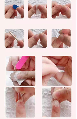 Step4: Fit the nail piece and press for 15 seconds. Heat with hair dryer to enhance the adhesion. Then avoid water&dust in 2 hours.
