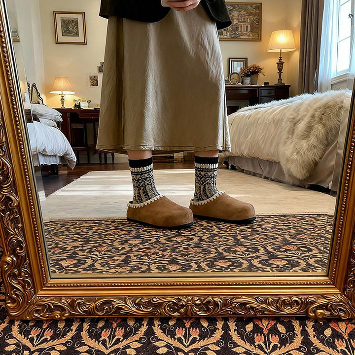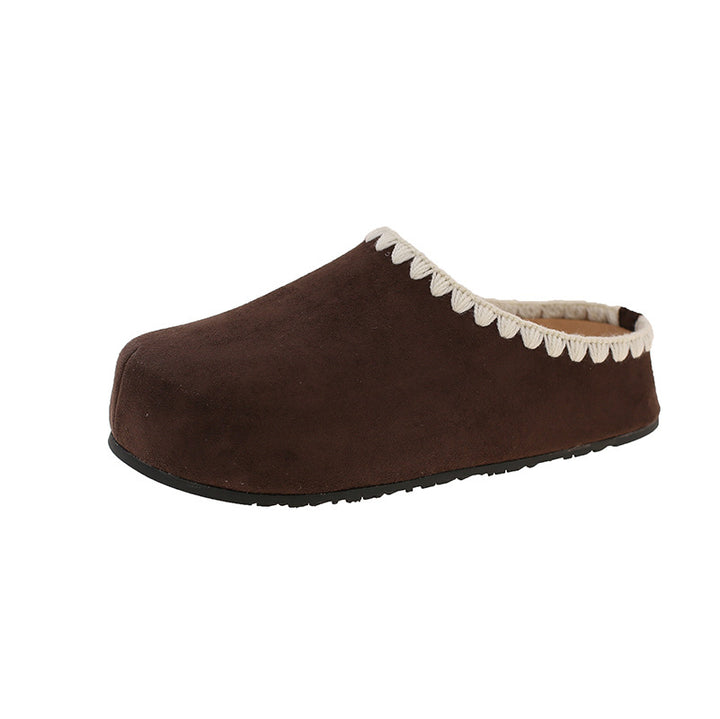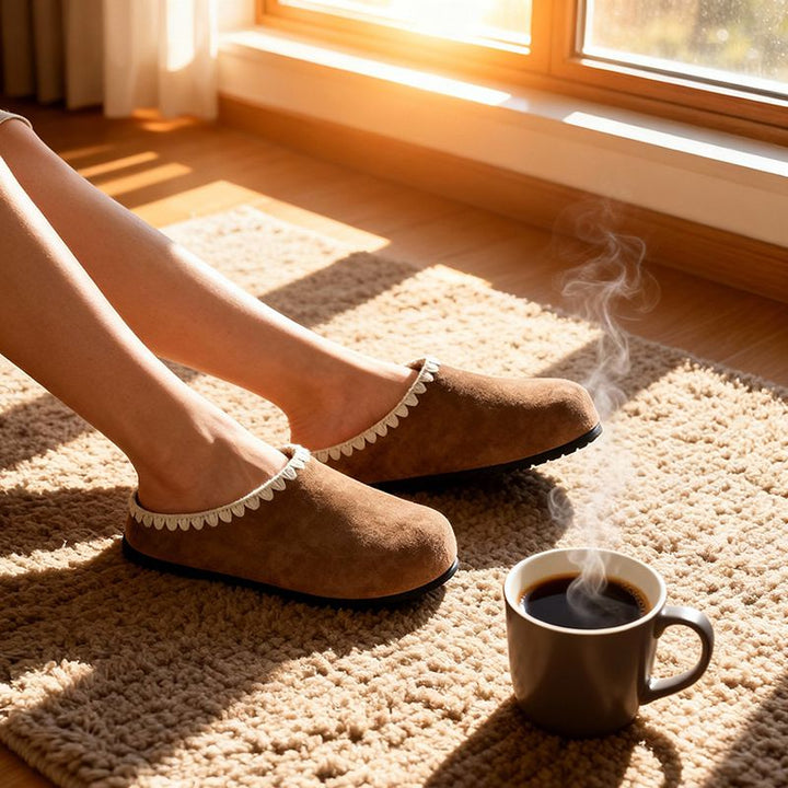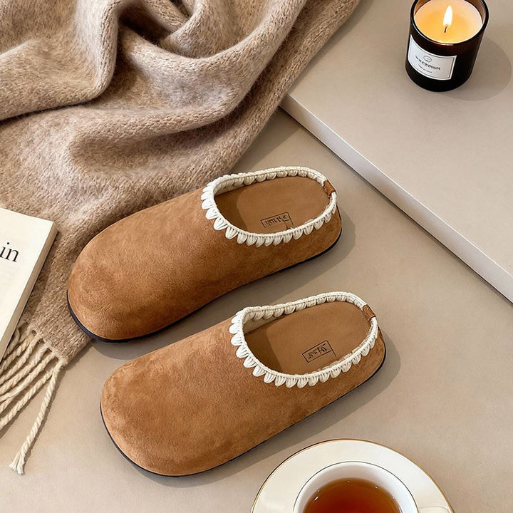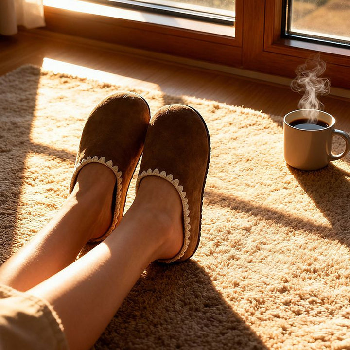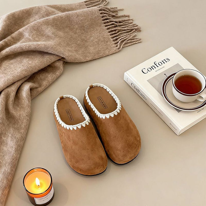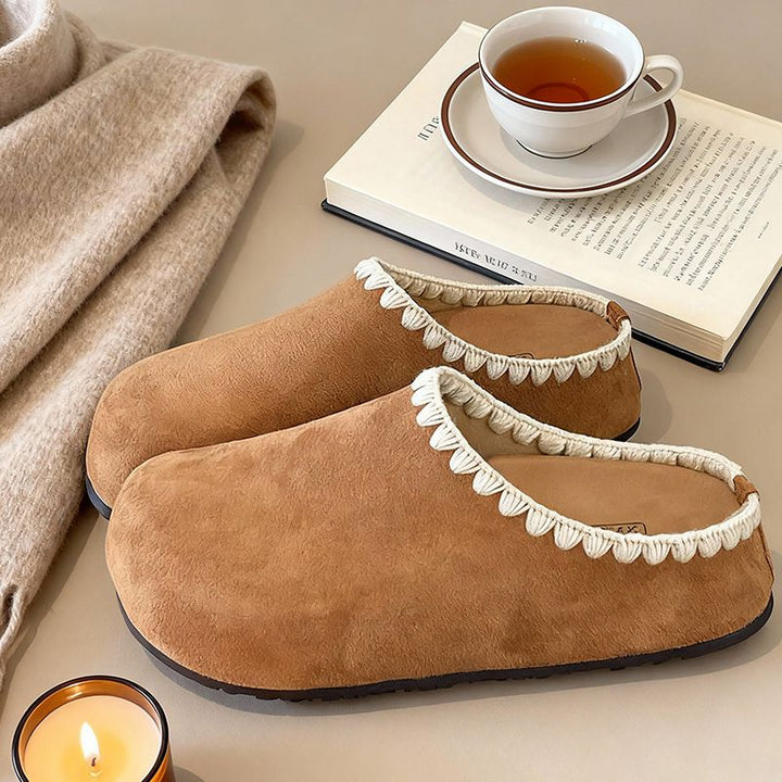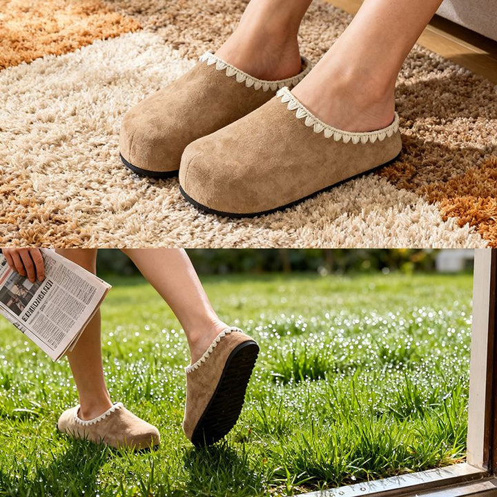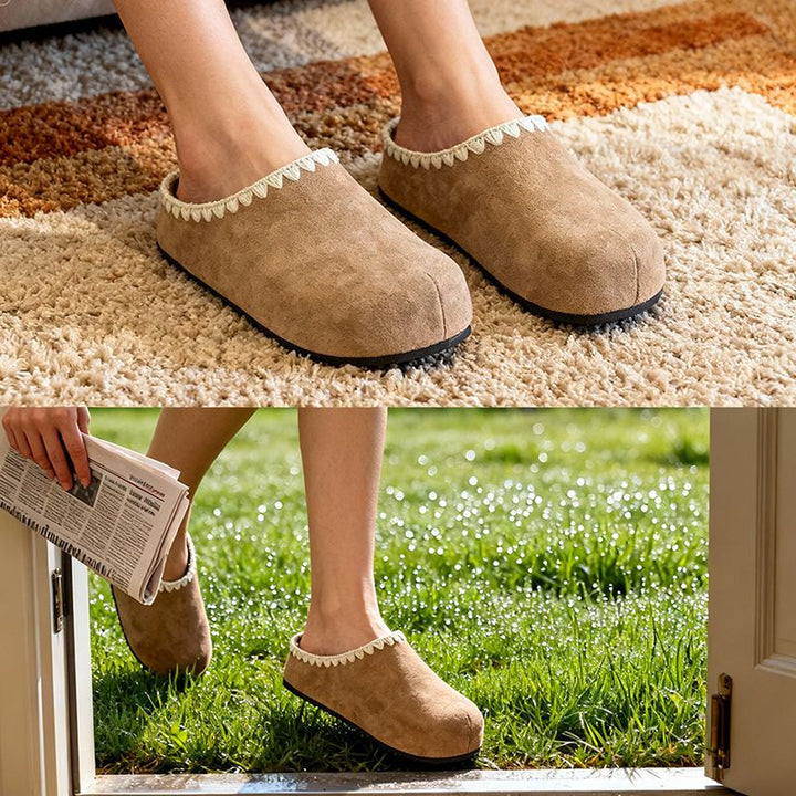 The contrast crochet edge slippers for women features crafted from the same rich faux suede, it's lined in wool blend for a slipper-like feel indoors or out.