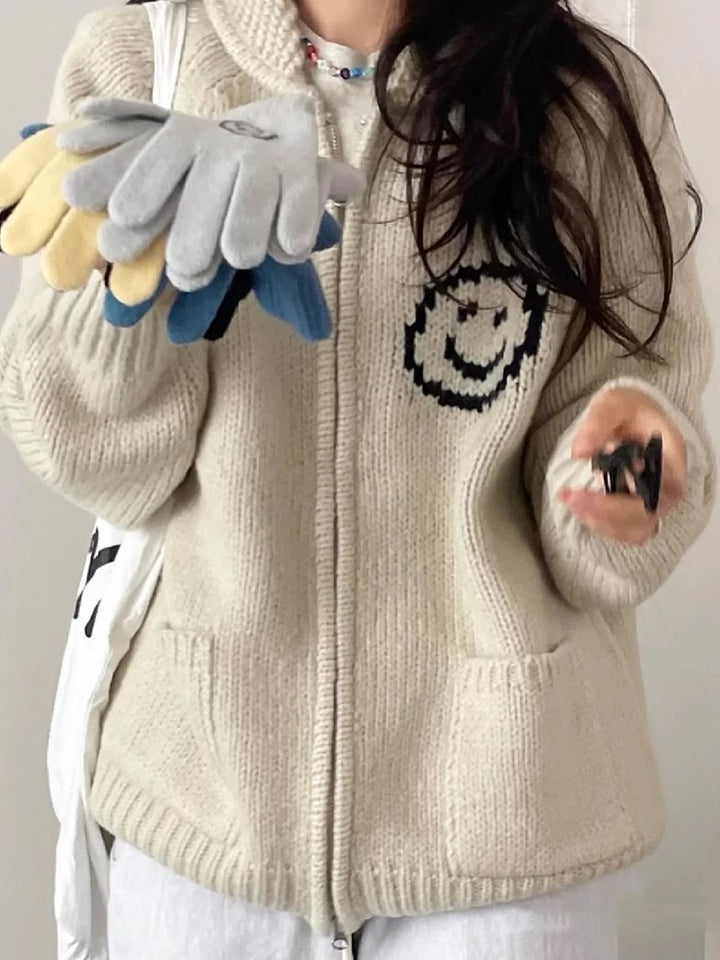 Design: Ribbed Sleeve, Zipper Front, Smile Face Front & Black, Loose, Oversized, Long Sleeves, Chunky, Pockets, Baggy Sleeve & Casual.
