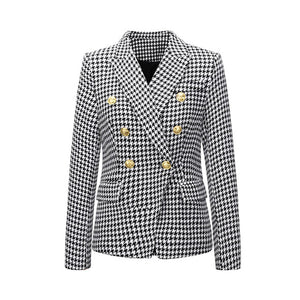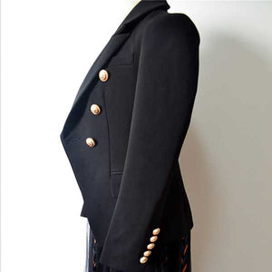 The classic double-breasted blazer for women features cool tough-luxe edge, double breasted button closure, 2 front flap pockets, embossed glossy golden metal hardware and classic lapel collar. This womens casual blazer suit jacket is of fasion design and oversized fit, liadies blazer jacket for any body type, for jeans & pants and for any official events & casual outfits.