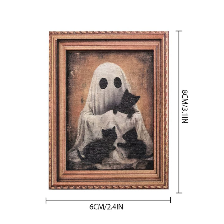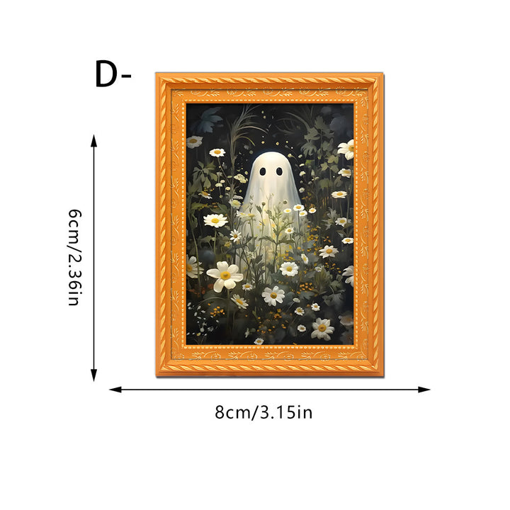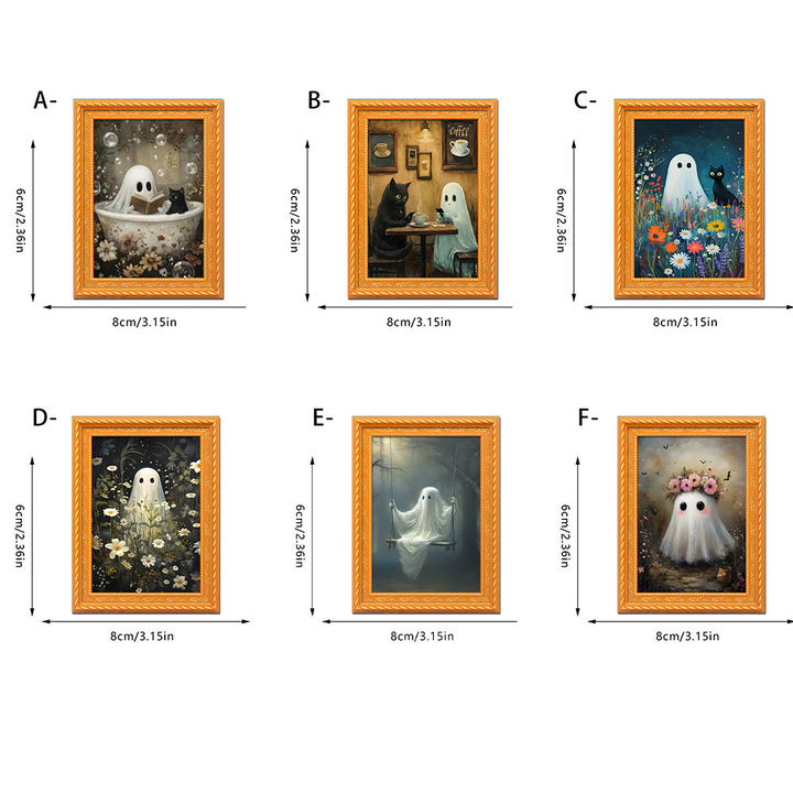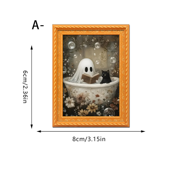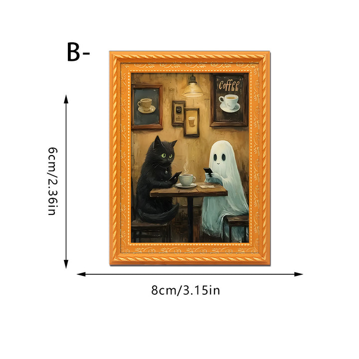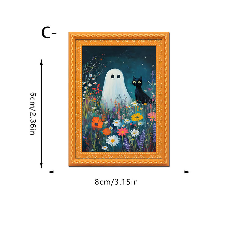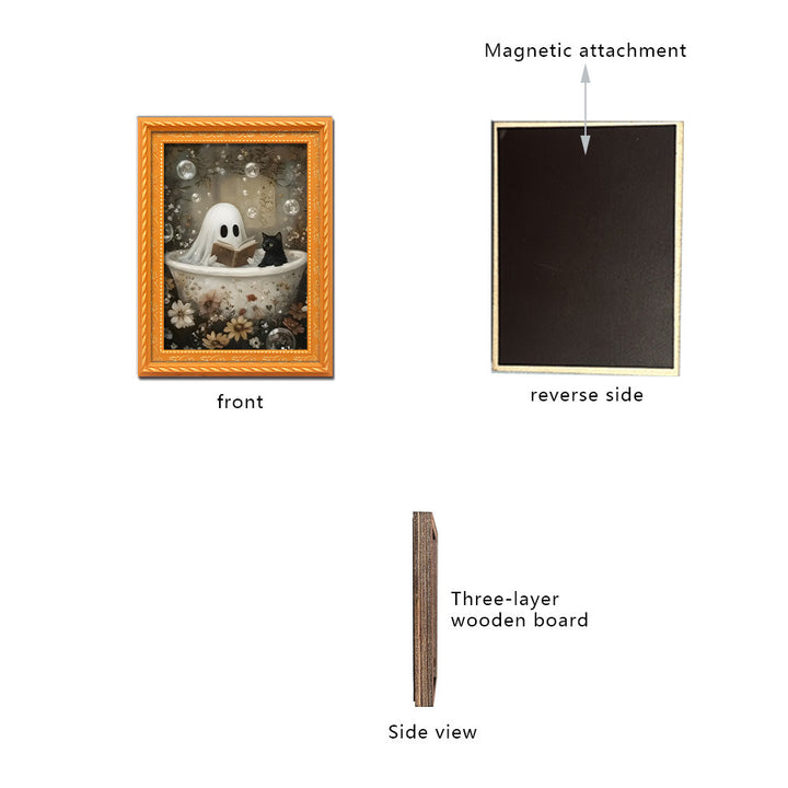 Unlike generic holiday decorations, our magnet features an original illustrated scene of a ghost and black cat sharing a cozy reading moment—a delightful twist on spooky season decor. The hand-finished wooden frame and vibrant digital printing create a keepsake-quality piece you’ll display year after year.