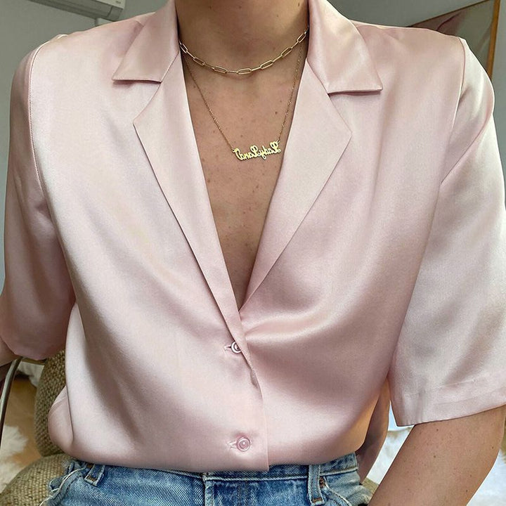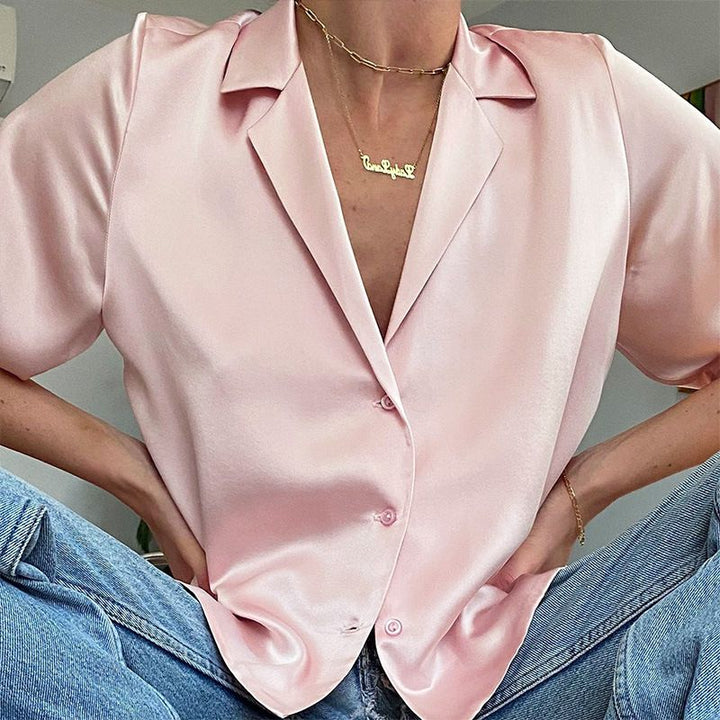 Lapel Collar Womens Short Sleeve Button Up Satin Shirts