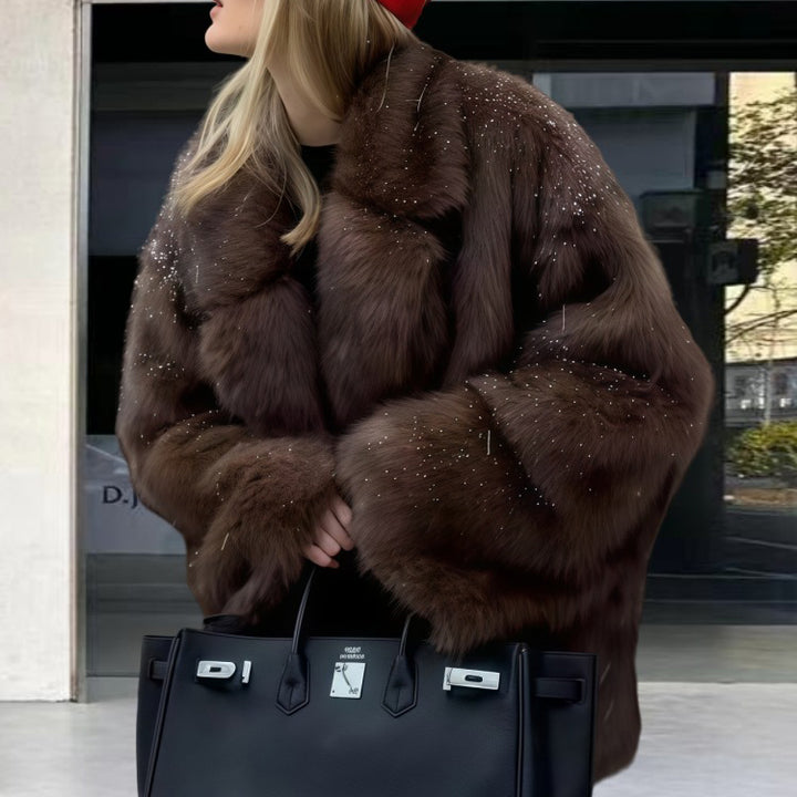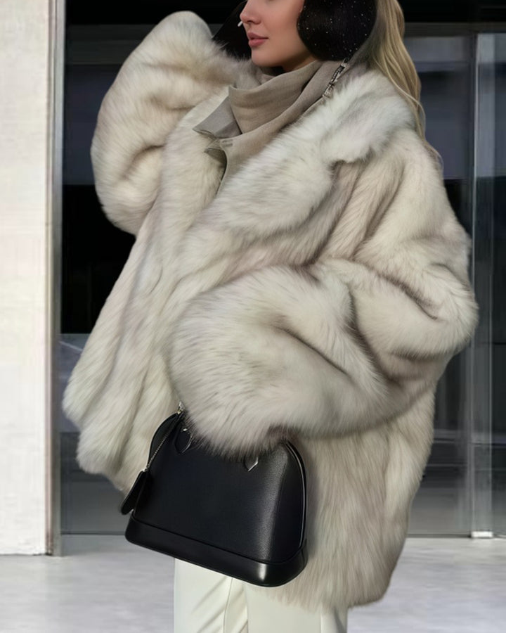Unlike many faux fur coats that appear artificial or stiff, the Luxe womens fur coat features an incredibly plush, high-density pile that closely mimics the softness and drape of natural fur. Its wide lapel collar and mid-length cut create a timeless, sophisticated silhouette that transitions effortlessly from day to night.