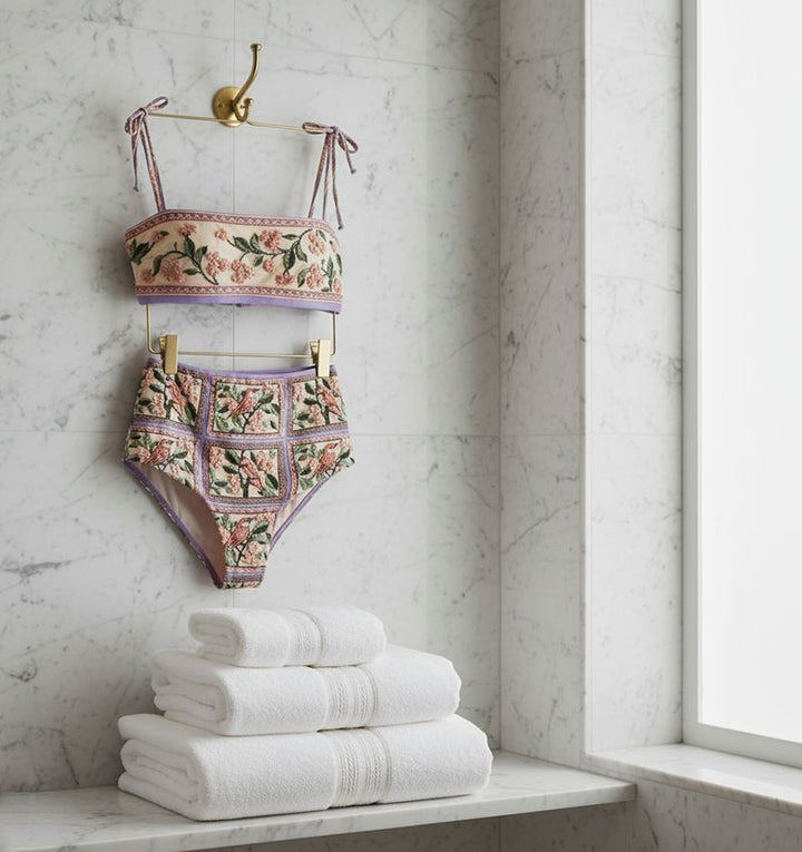 Design: Color block bikini, triangle top bikini, cheeky bikini bottoms, summer swimwear, unique print bikini, beachwear, poolside style.