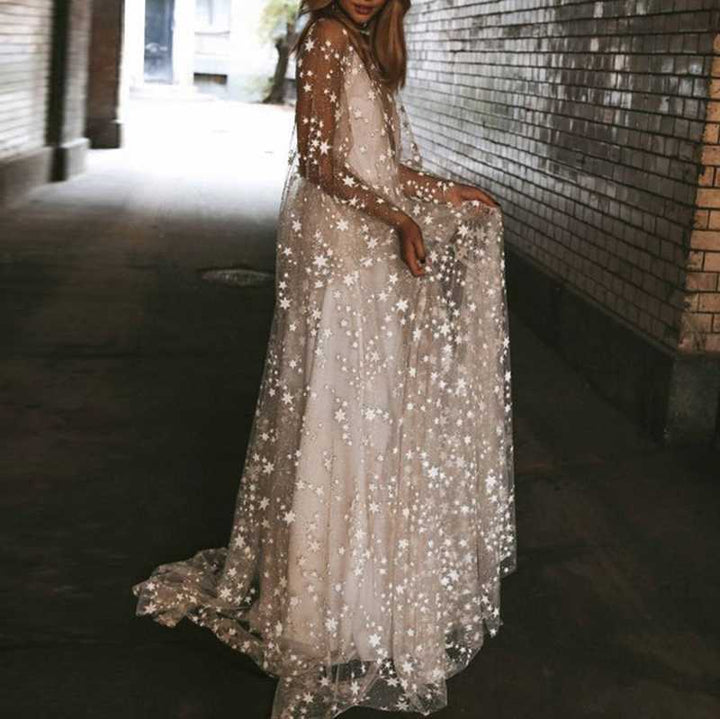 Shiny Star Embellished Mesh Overlay Maxi Dress Formal Gowns