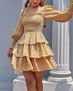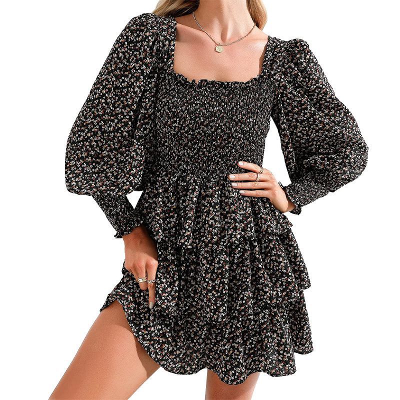 - The?ditsy floral shirred square neck?dress?features?mix floral print,Stretchy ruched detailing on top for elastic fitting, Frilly ruffle hem detail, flare smocked dress and Fitted in all the right places.