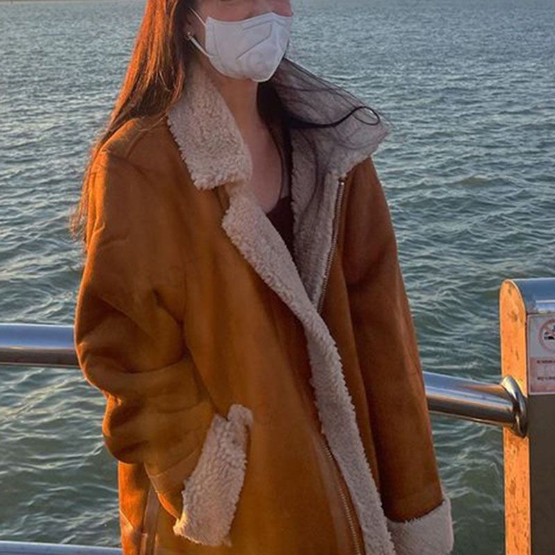 - This thick fur faux lined sheepskin suede leather moto biker coat features plush & fuzzy full shearling, button up closure, 2 pockets, cropped and Long sleeves. This aviator suede jacket with shearling is for any body type, any height, for a lots of layers underneath, and for any chilly cold weather.
